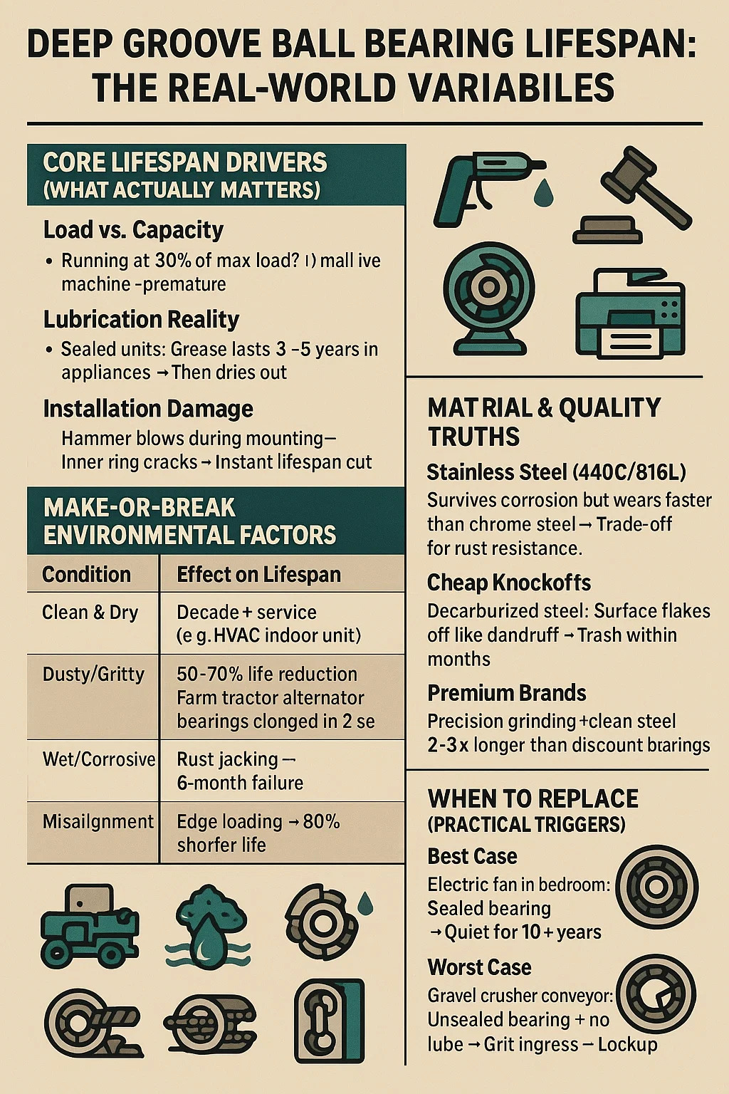 | Czyste i suche | Serwis dziesięcioletni (np. jednostka wewnętrzna HVAC) | Łożyska drukarek biurowych kręcą się od 15 lat |