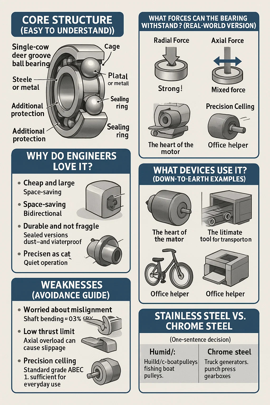 Łożyska poprzeczne: Rowki w kształcie łuku na pierścieniach wewnętrznych i zewnętrznych są głębsze niż kulki, co zapewnia pewny chwyt i płynny ruch toczny.